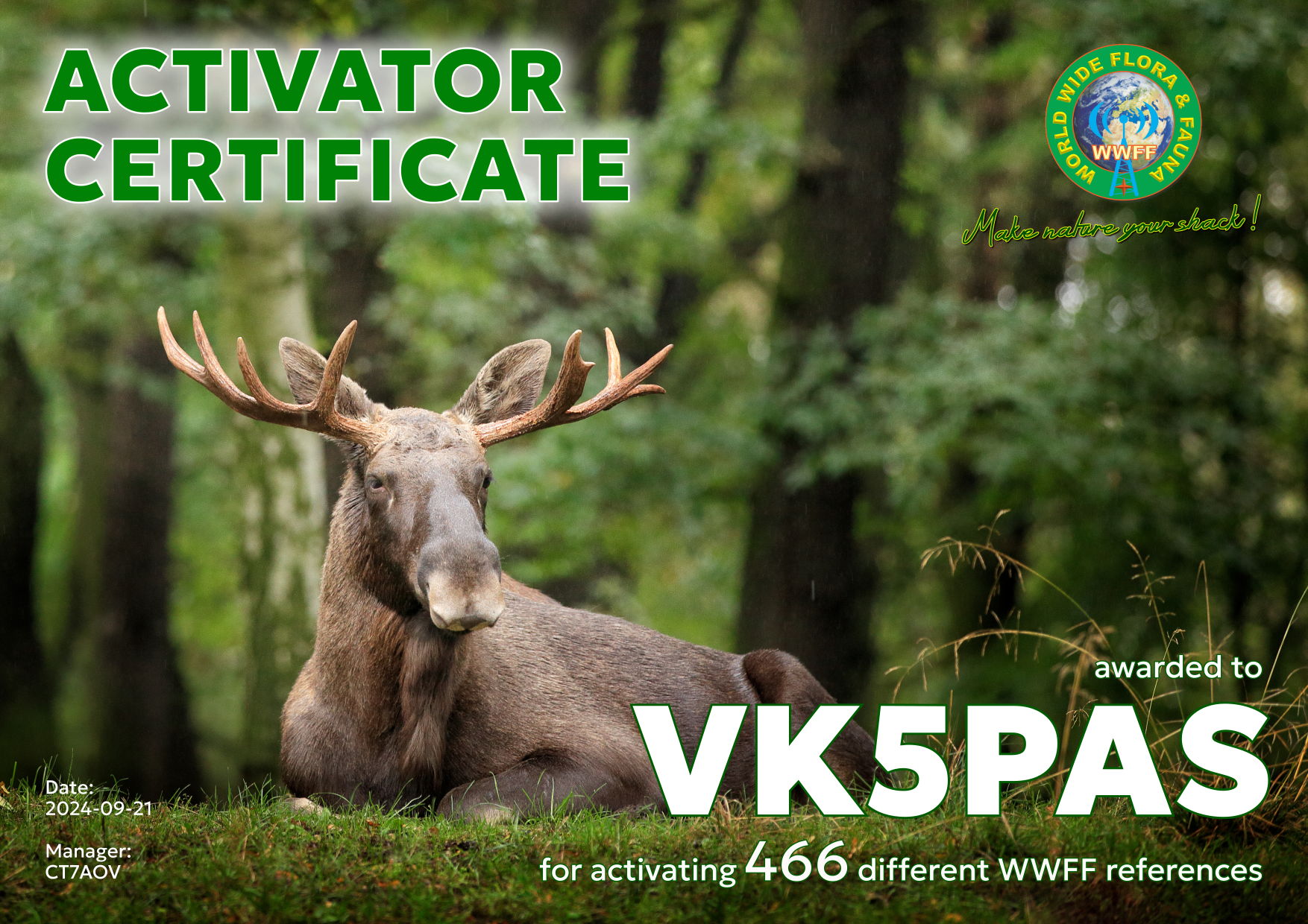 About a week ago I received in my email Inbox, my latest WWFF Activator certificate. It is issued for having activated a total of 466 different references and reaching at least 44 QSOs in each.