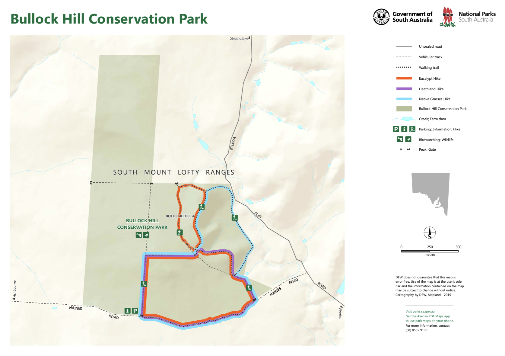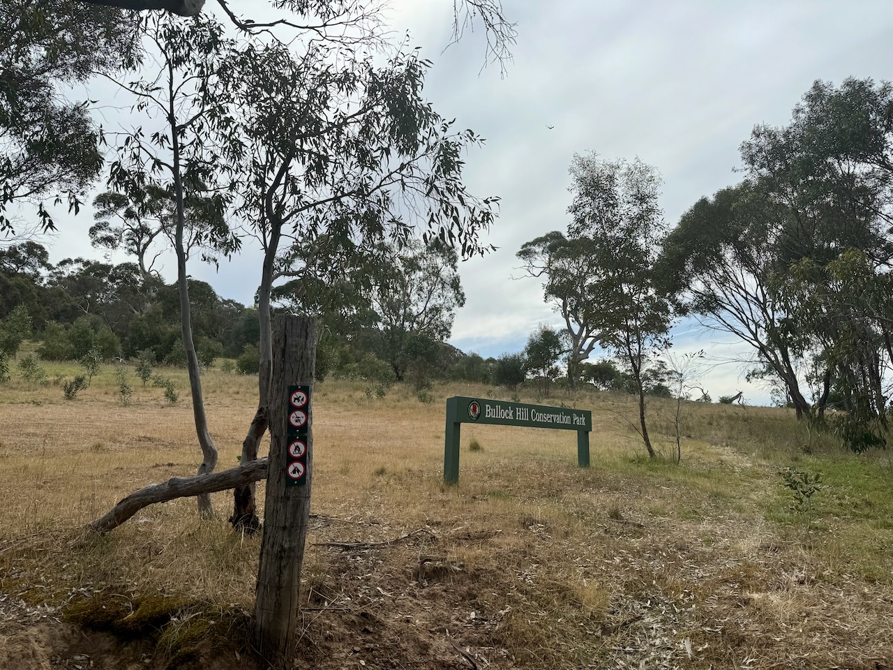 The park’s eastern boundary is Wattle Flat Road. Its southern boundary is Haines Road. A heritage agreement exists on the western side of the park. It takes its name from Bullock Hill, a hill rising 188 metres above sea level.