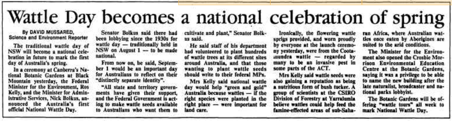 On 23 June 1992, Governor-General Bill Hayden declared that “1 September in each year shall be observed as ‘National Wattle Day’ throughout Australia and in the external Territories of Australia”. (ANBG 2024)