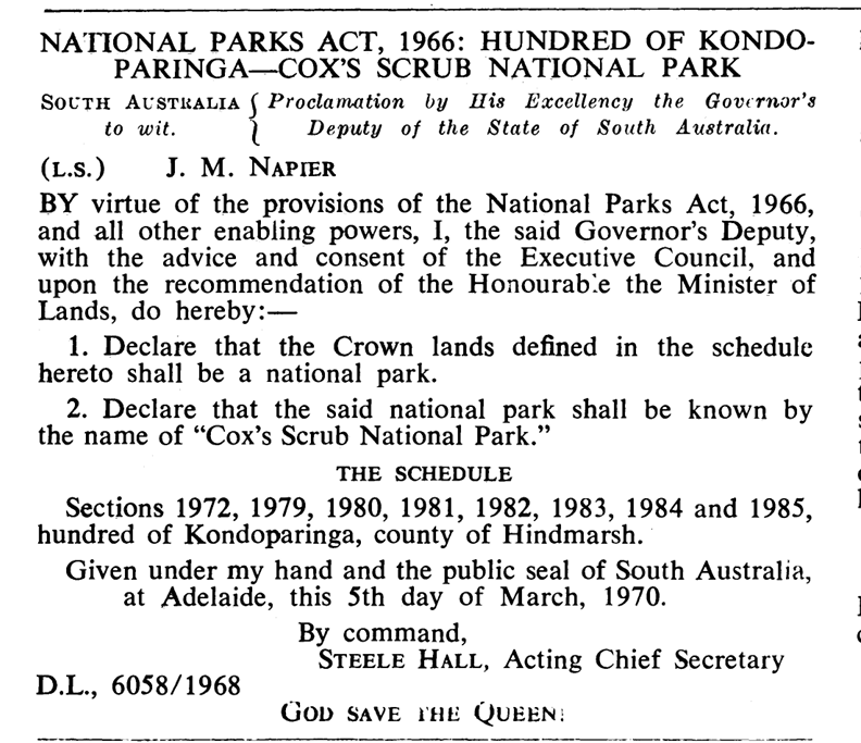 Above:- Proclamation of the Cox Scrub National Park, SA Govt Gazette, 5 March 1970