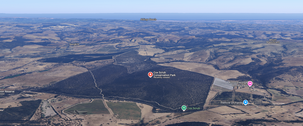 Above:- An aerial view of the Cox Scrub Conservation Park. Image c/o Google Maps.