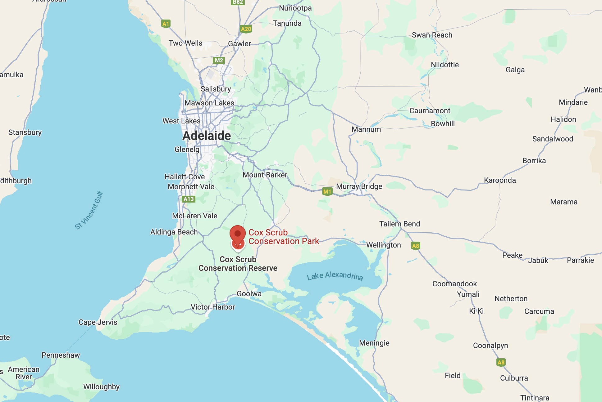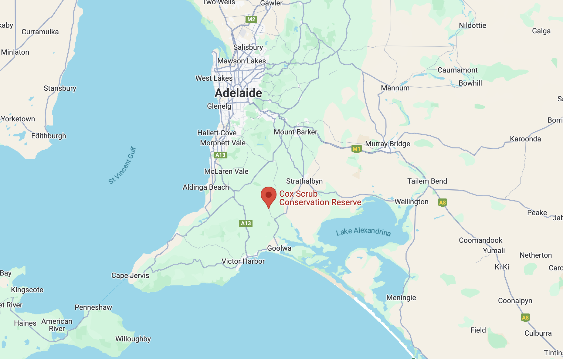 Above:- Map showing the location of the Cox Scrub Conservation Park. Map c/o Google Maps.