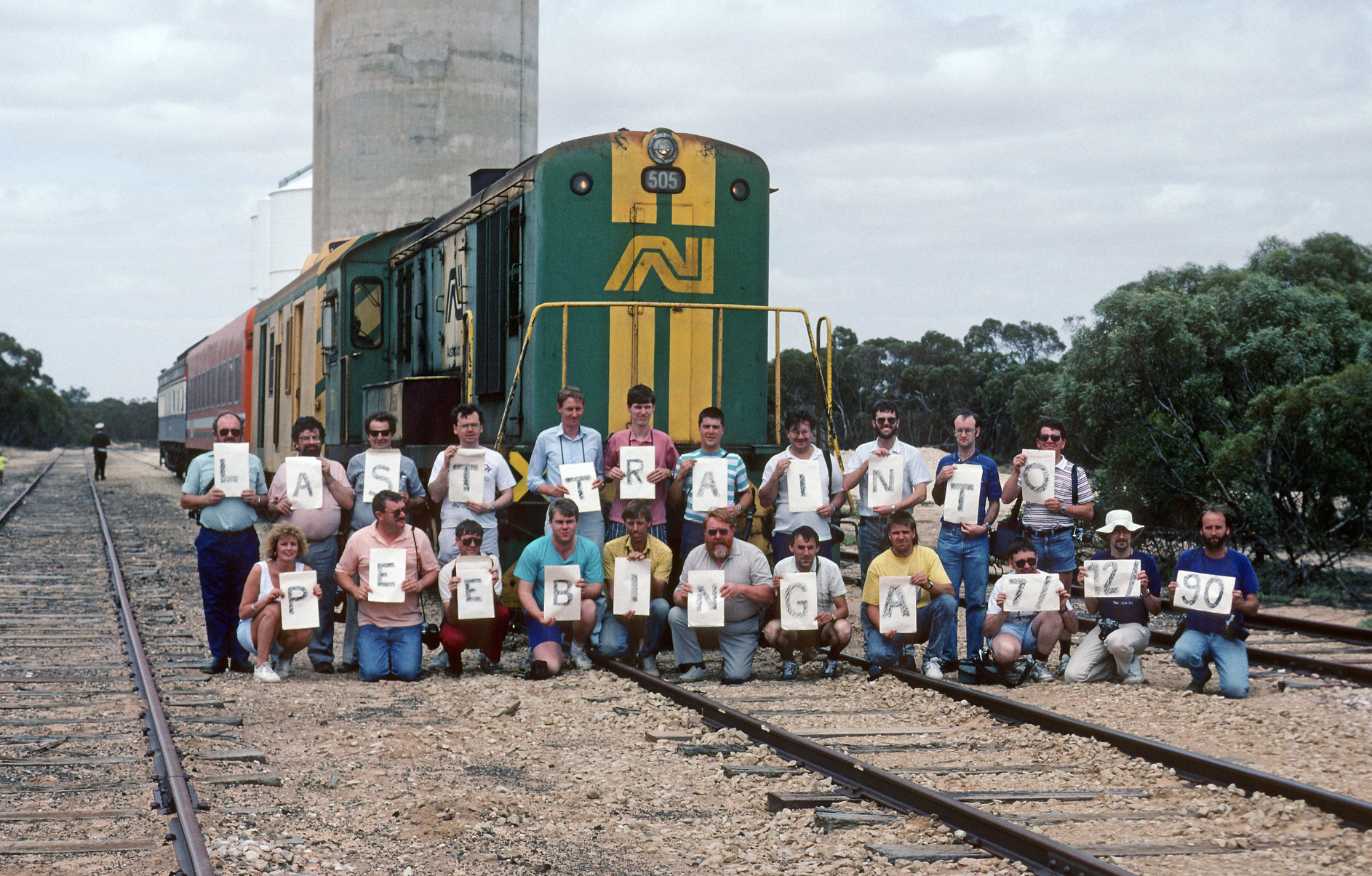 Above:- An Railway Tourist Association group with the last passenger train to Peebinga, South Australia, 7 Dec. 1990. Image c/o Flickr