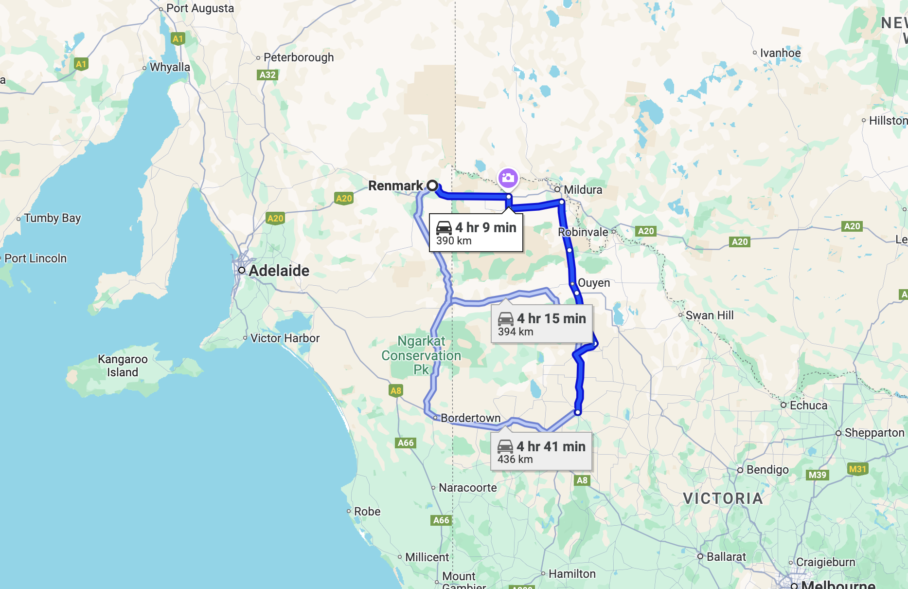 Above:- Map showing our route from Renmark to Warracknabeal. Map c/o Google Maps.