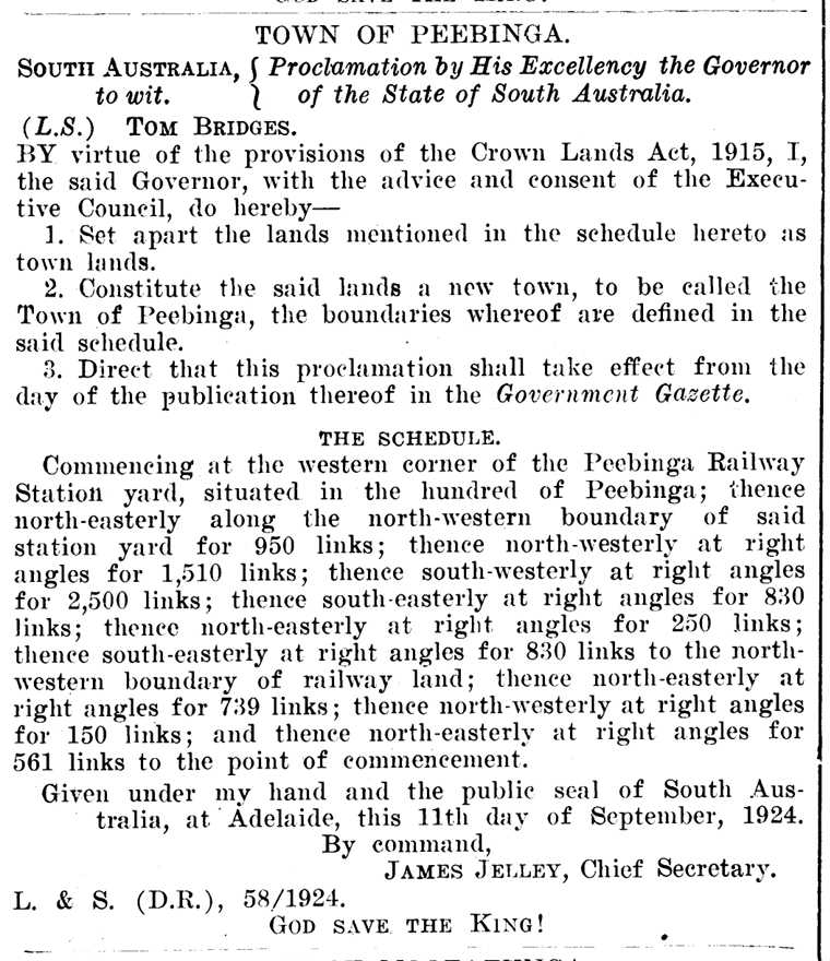 Above:- Proclamation of the town of Peebinga, SA Govt Gazette, 25 Sep 1924.