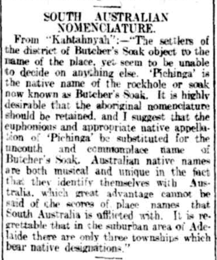 In 1912 an article appeared in The Register which referred to “The settlers of the district of Butcher’s Soak object to the name of the place…..’Pichinga’ is the native name of the rockhole or soak known as Butcher’s Soak. It is highly desirable that the aboriginal nomenclature should be retained, and I suggest that the euphonious and appropriate native appellation of ‘Pichinga’ be substituted for the uncouth and commonplace name of Butcher’s Soak.” (Trove 2024)