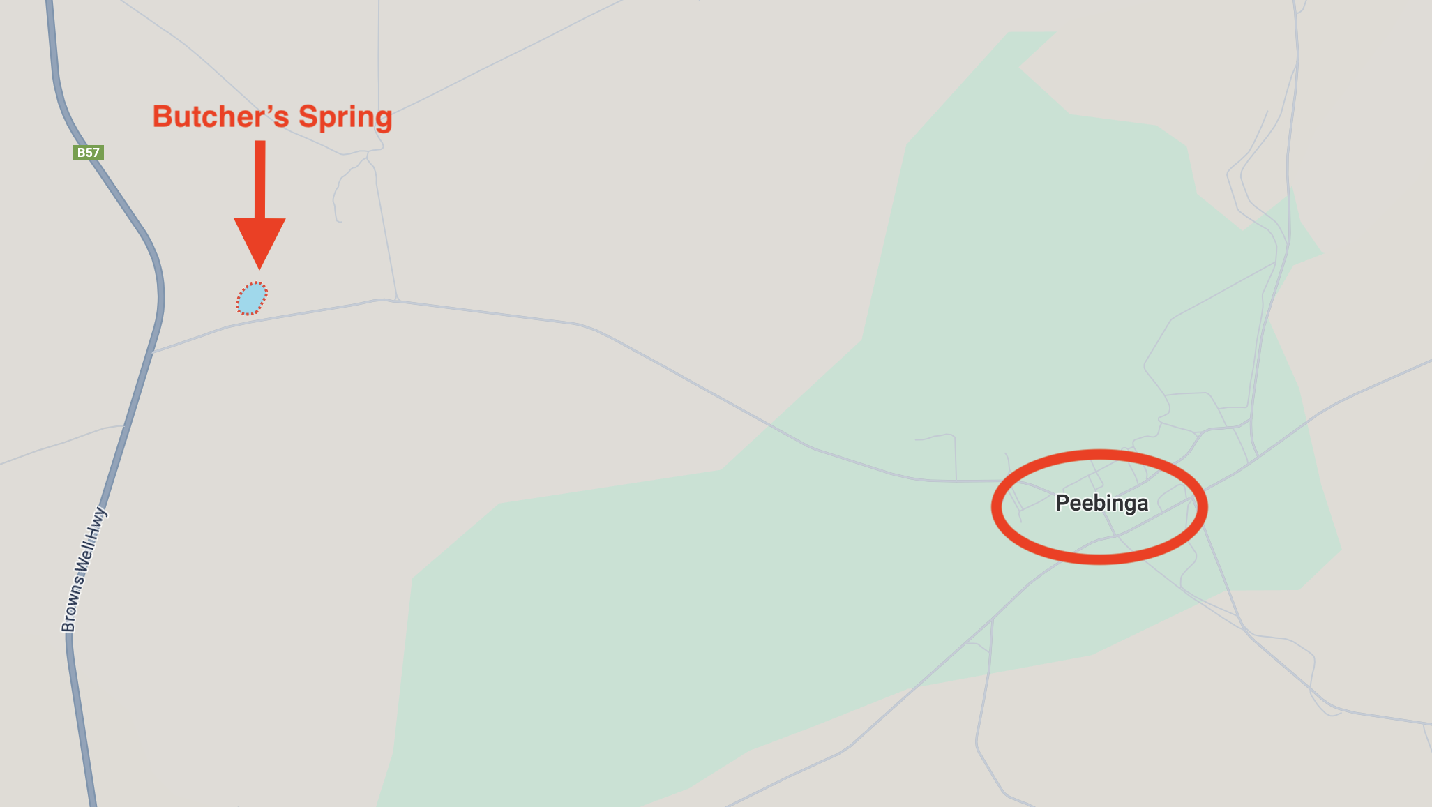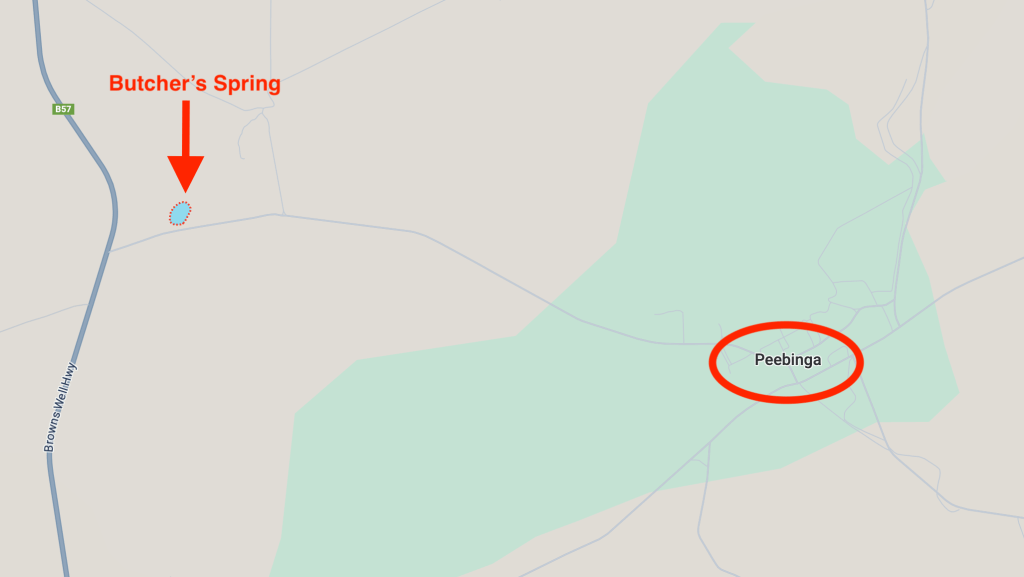 Above:- Map showing the location of Butcher’s Spring and Peebinga. Map c/o Google Maps.