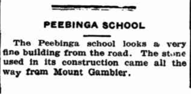 The Peebinga school opened in 1925 and closed in 1965. From 1925, the government school operated in the Peebinga Hall. In 1927 the Mount Gambier limestone schoolroom was constructed. Mr. WIlliam Wilshire was the last teacher who taught at Peebinga from 1946 to 1965. There was also a government school a short distance away at Butcher’s Soak which opened in 1922 and closed in 1926 when the new stone school at Peebinga opened in February 1927. (Flickr 2024)