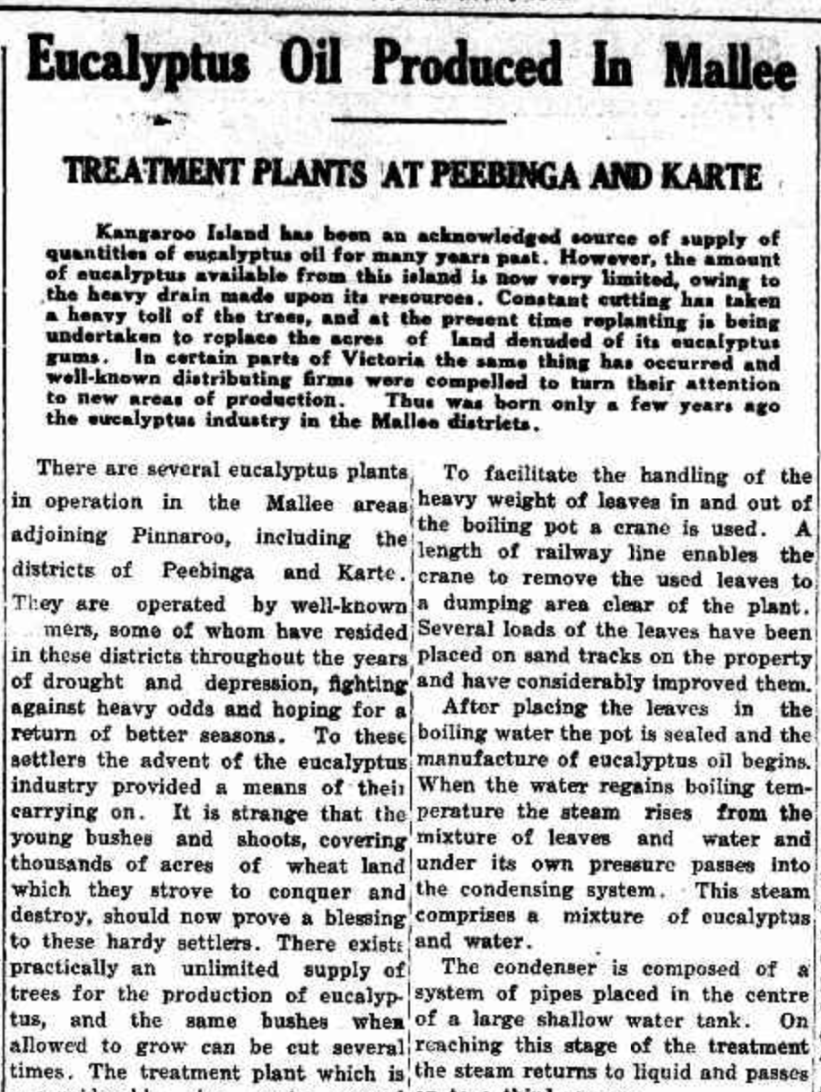 Between the 1930s and the early 1970s, several farmers in the Peebinga district had eucalyptus distilleries on their properties. The local eucalypts that grew in the area were high in oil content. The eucalyptus oil was sold to Faulding and Co. (Flickr 2024)