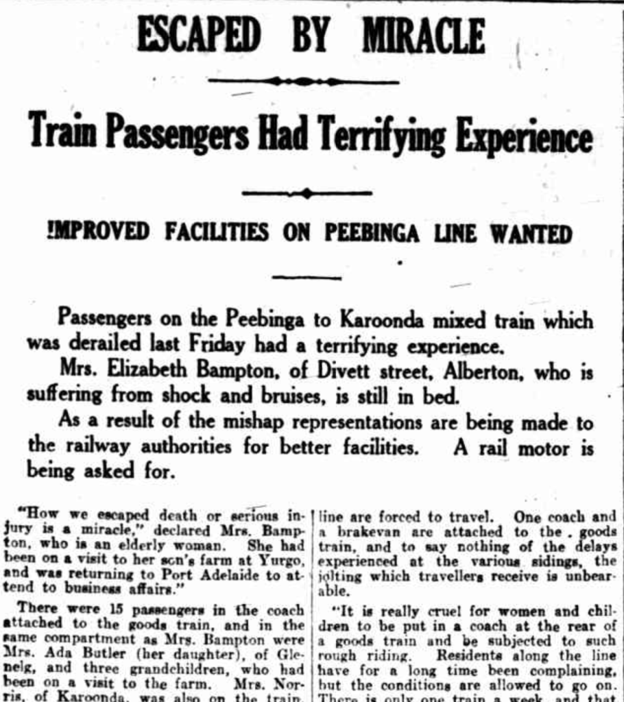 During the early-1920s, Peebinga locals complained about the line. This culminated in a derailment in 1924.