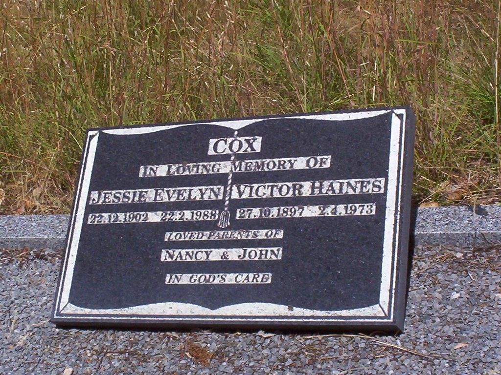Victor Haines Cox was born on the 27th day of October 1987 at Strathalbyn. In 1935 he married Jessie Evelyn Moore at Victor Harbour, South Australia. They had two children. Victor died on the 2nd day of April 1973 at Giles Flat, South Australia. He is buried at the Ashbourne cemetery, South Australia. (ancestry.com.au)