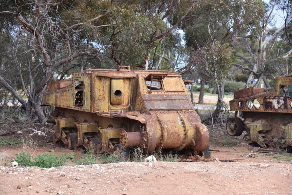 The story behind these tanks varies depending on what you read on the internet. I found some YouTube posts where it was reported that the tanks were purchased from an army disposal sale at Bandiana near Wodonga. It is reported that they were purchased for steel to be used in an engineering manufacturing business owned by Peter Peers. Two were used in his limestone surface quarry at Cowangie. Several others were sold to military collectors while another was donated to a military museum. Engines were used in other earthmoving machinery built by Peers. Armour plate from the tanks was also used to construct chain which was pulled to clear mallee scrub. (Murrayville Tank Graveyard 2017) (On Roads Less Travelled 2024)