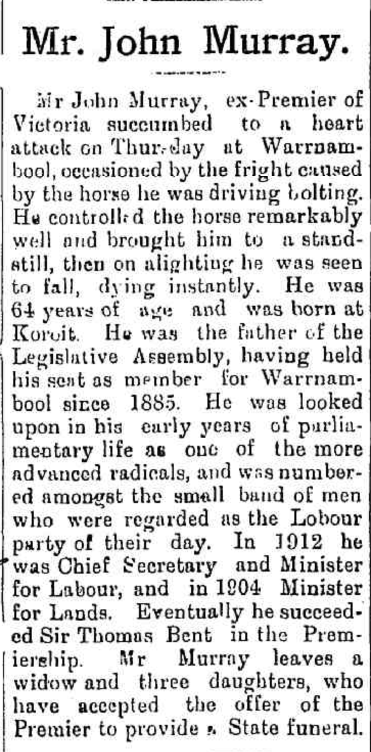 On the 4th day of May 1916, Murray was riding on his horse, along a street in Warrnambool. His horse was frightened and bolted. Murray eventually controlled the horse and upon his alighting, he collapsed and died. He was buried with a State funeral attended by nearly 2,000 people including First Nation’s people. His funeral procession was nearly 3.2 km long. (Aust. Dict. Biography 2024)