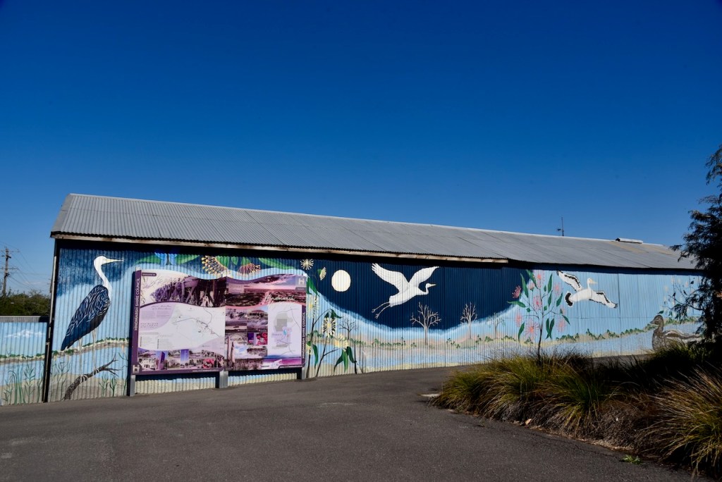 We stopped at Menzies Square on the corner of Roy Street and Dimboola-Rainbow Road. There is an impressive mural painted on the side of a shed which features several local bird species.