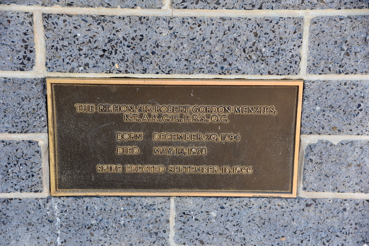 We then visited the Menzies Spire, an 18-metre-tall grey steel column with a thistle on the top. It is located at the corner of Charles Street and Sands Avenue at the entrance to Robert Menzies Park. (Aussie Towns 2024)