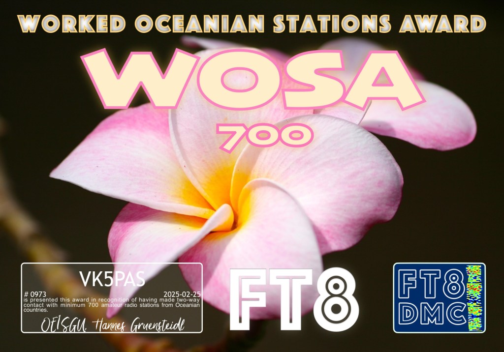 Here are my latest FT8 award certificates.