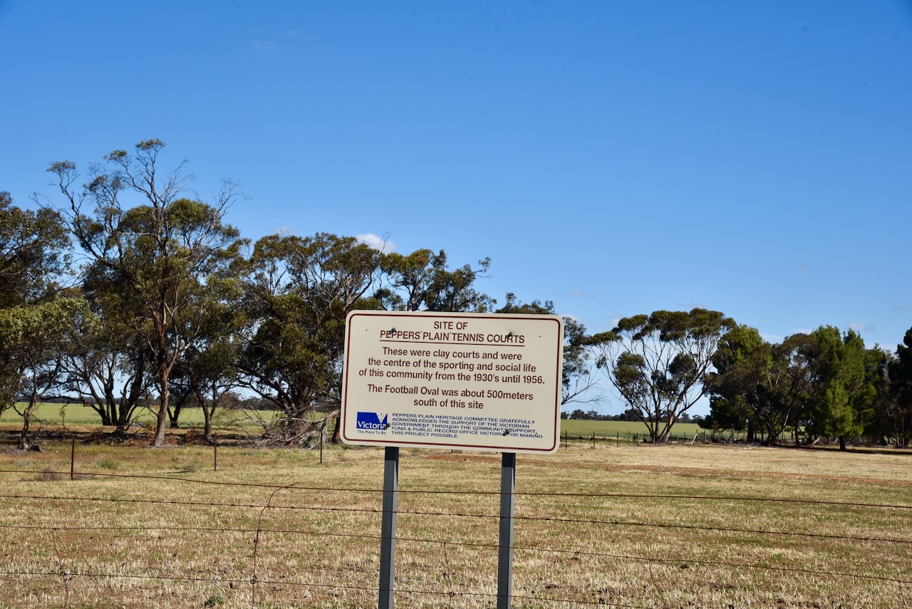 Peppers Plain was once a thriving community. The old tennis courts are now an overgrown paddock. The clay tennis courts were the centre of the sporting and social life of the community from the 1930s until 1956. The Peppers Plain football oval was also located nearby.
