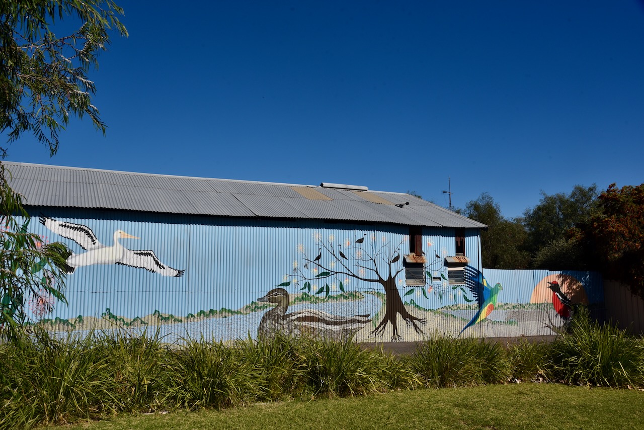 We stopped at Menzies Square on the corner of Roy Street and Dimboola-Rainbow Road. There is an impressive mural painted on the side of a shed which features several local bird species.