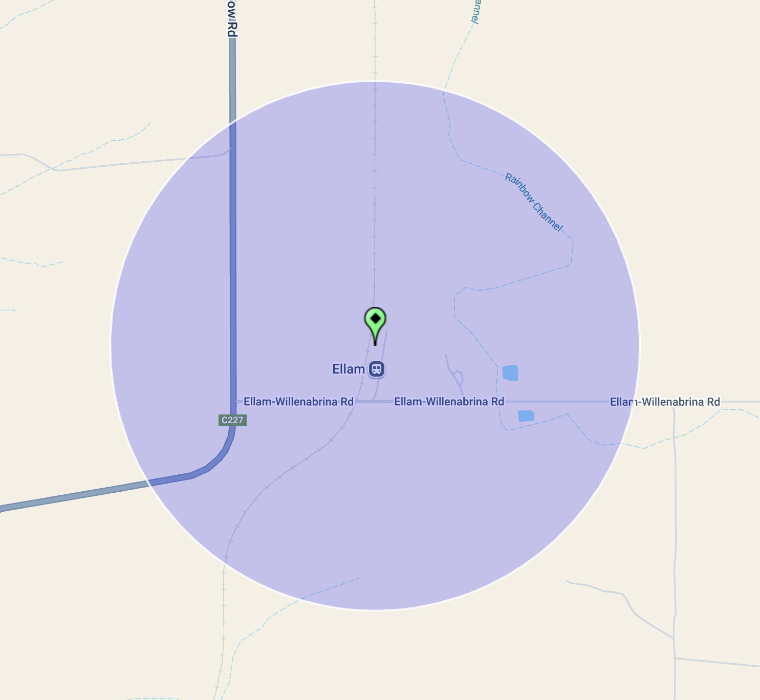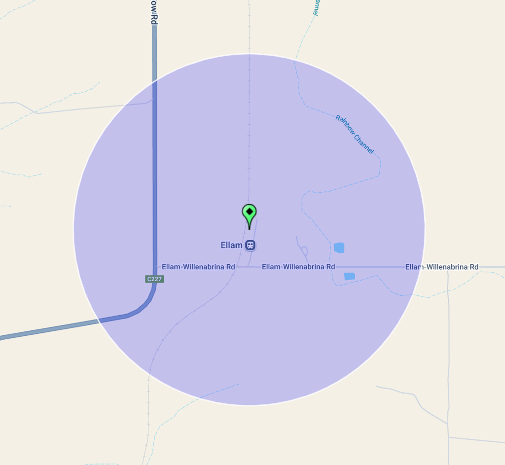 Ellam is located about 384 km northwest of the city of Melbourne, and about 15 km north of the town of Jeparit.