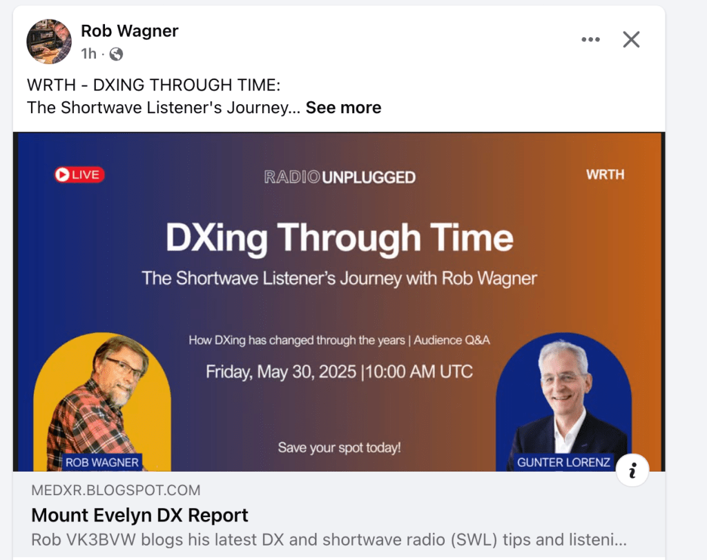On the 30th May 2025, I attended a World Radio TV Handbook ‘Radio Unplugged’ presentation by Microsoft Teams. It was entitled ‘DXing Through Time and was presented by Rob Wagner VK3BVW.