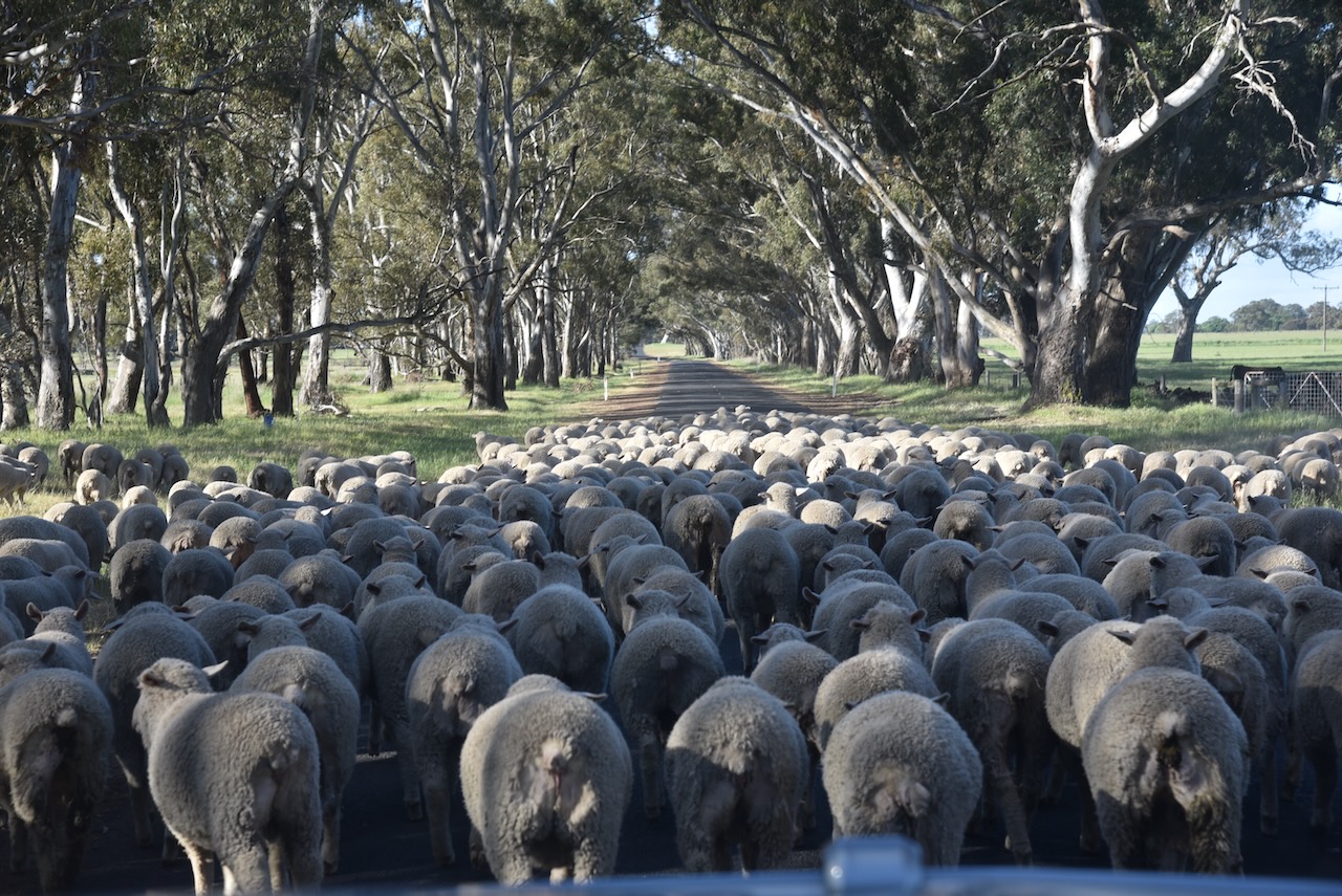 We continued north along the Casterton-Narracourte Road towards Apsley and encountered a distinct Australian scene…..sheep being herded by a farmer across the road.