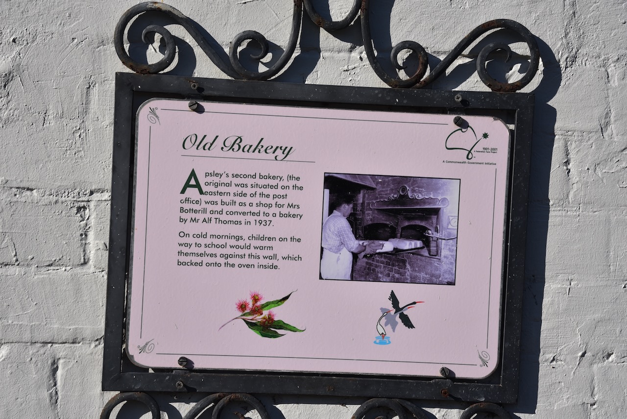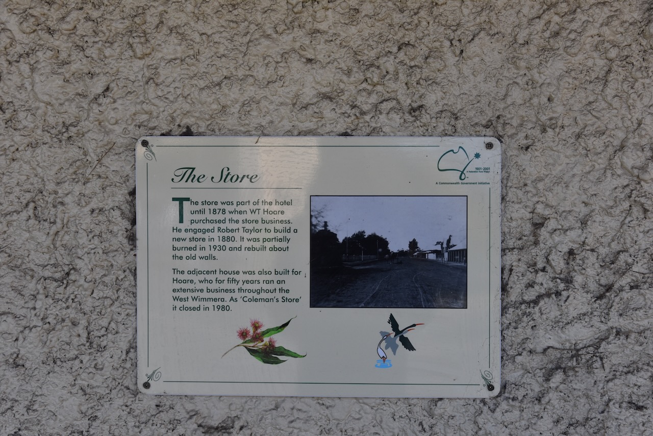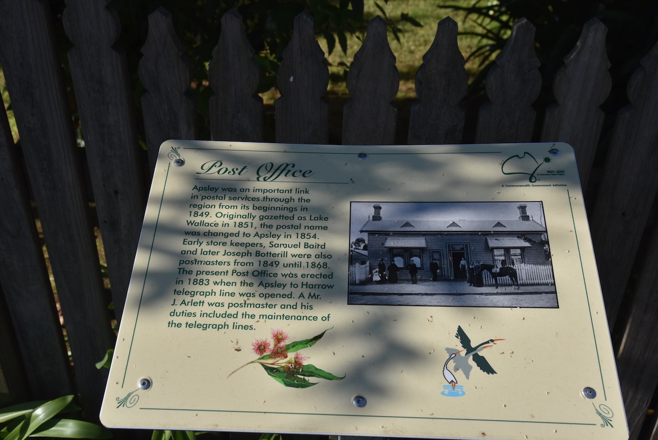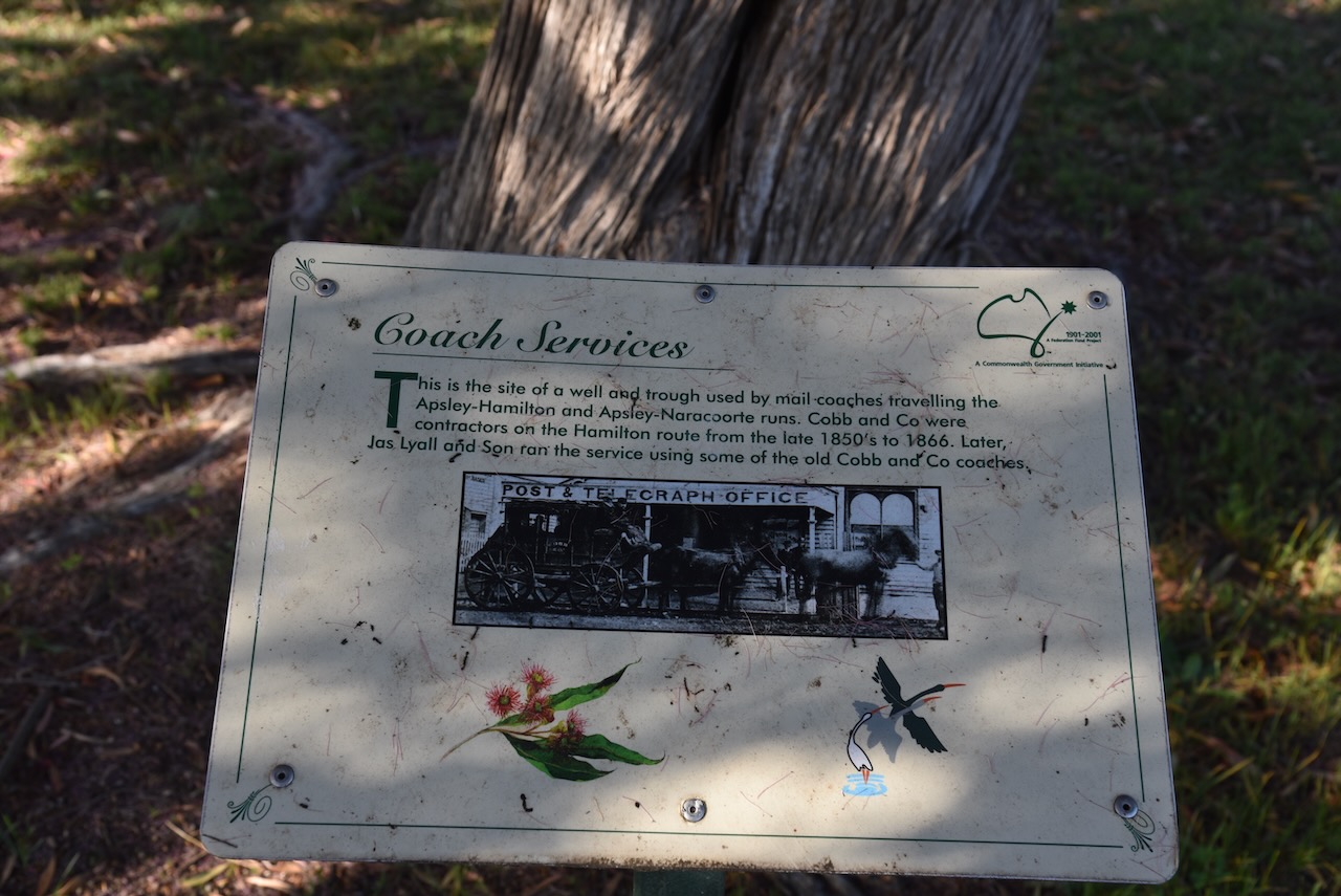 Near the Post Office is a sign that marks the site of a well and trough that was used by mail coaches travelling along the Apsley-Hamilton and Apsley-Narracoorte runs. From the late 1850s until 1866, Cobb and Co. were the contractors on the Hamilton route.