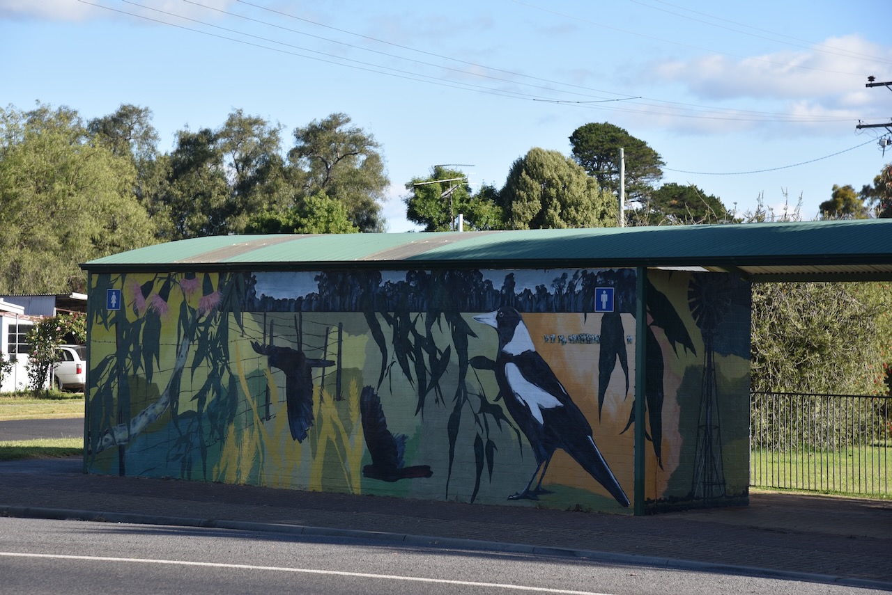 Adjacent to the Post Office is a toilet block which has been very colorfully painted with a mural.