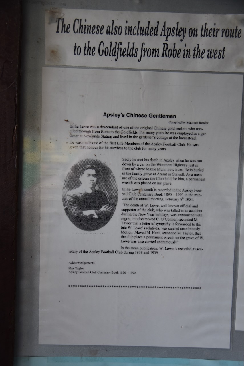 During the 1850s, a customs house was established for trade between the two colonies of South Australia and Victoria. In 1861, the Apsley agricultural and pastoral society was established. The Apsley Common School opened in 1870. A mechanics institute was built in the 1880s. (Victorian Places 2025)