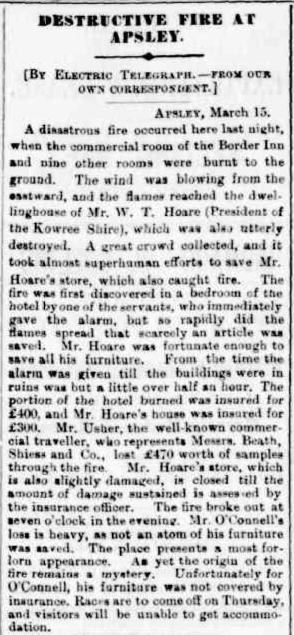 The Apsley Store was part of the hotel until 1878, when W.T. Hoare purchased the store business. In 1880, he engaged Robert Taylor to build another store. In 1930 the building was partically burnt and it was rebuilt around the old walls.