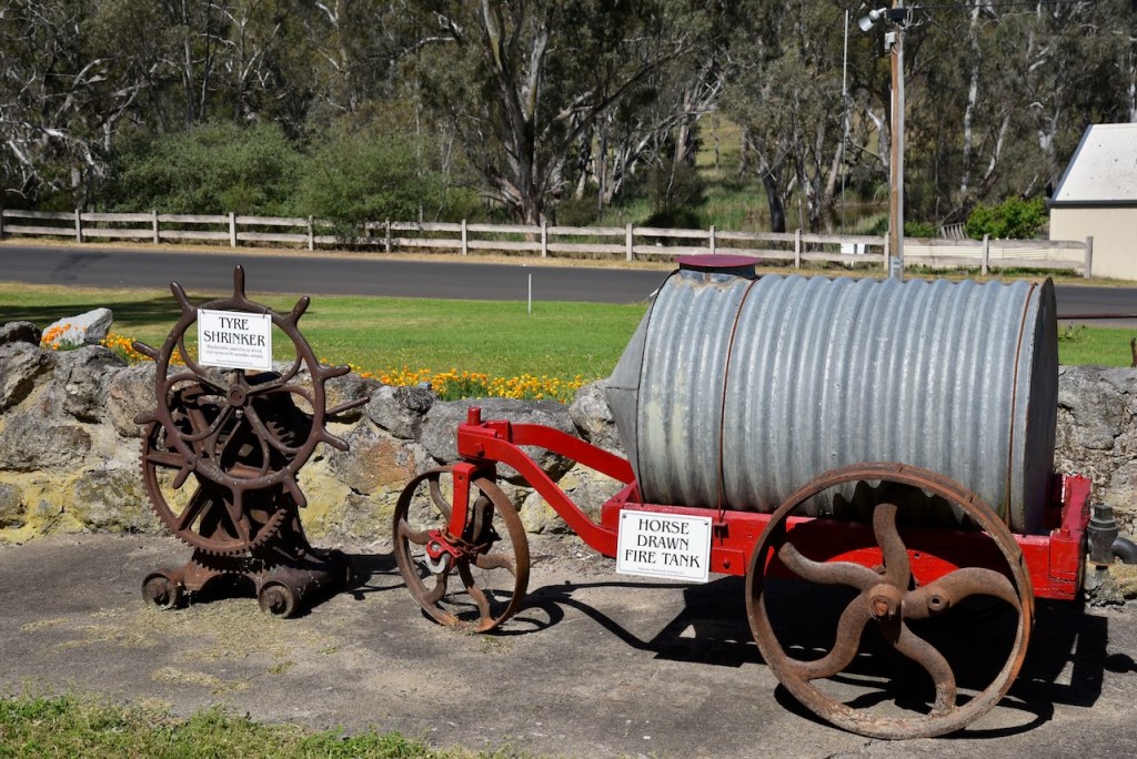Near the cottage is an old horse drawn fire tank and an old tyre shrinker that was used by blacksmiths to shrink iron tyres to fit wooden wheels.