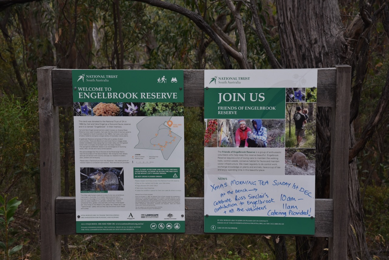 Engelbrook Reserve is a Heritage Agreement that is owned by the National Trust. The National Trust of South Australia was established in 1955 for the conservation of lands and buildings of beauty, historical, scientific, artistic, or architectural interest, the preservation of natural features in land and the protection of animal and plant life. (National Trust)