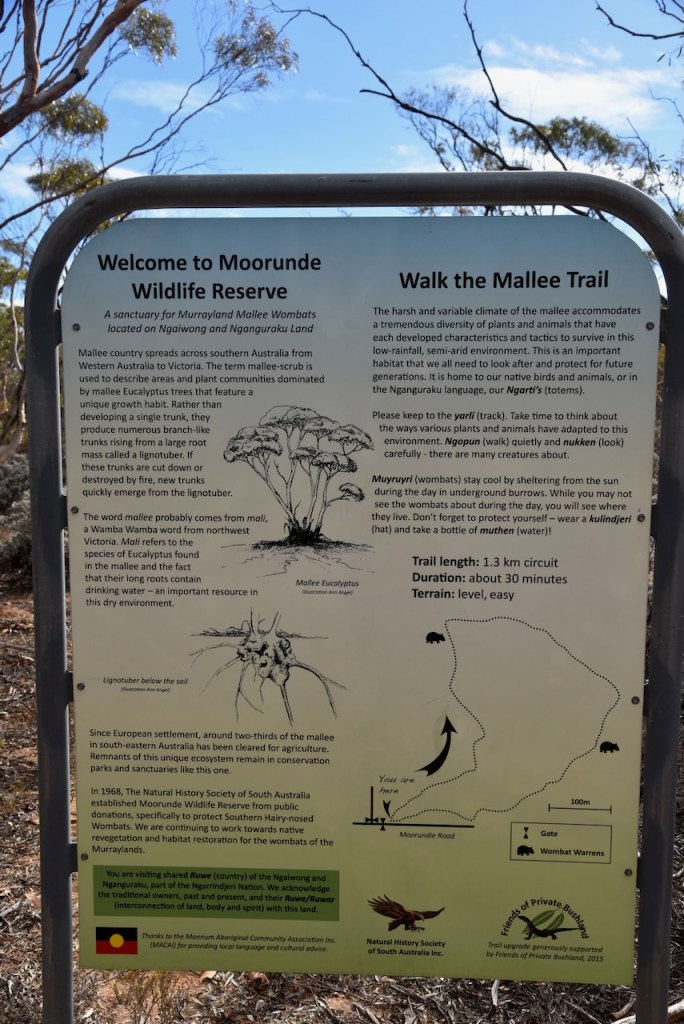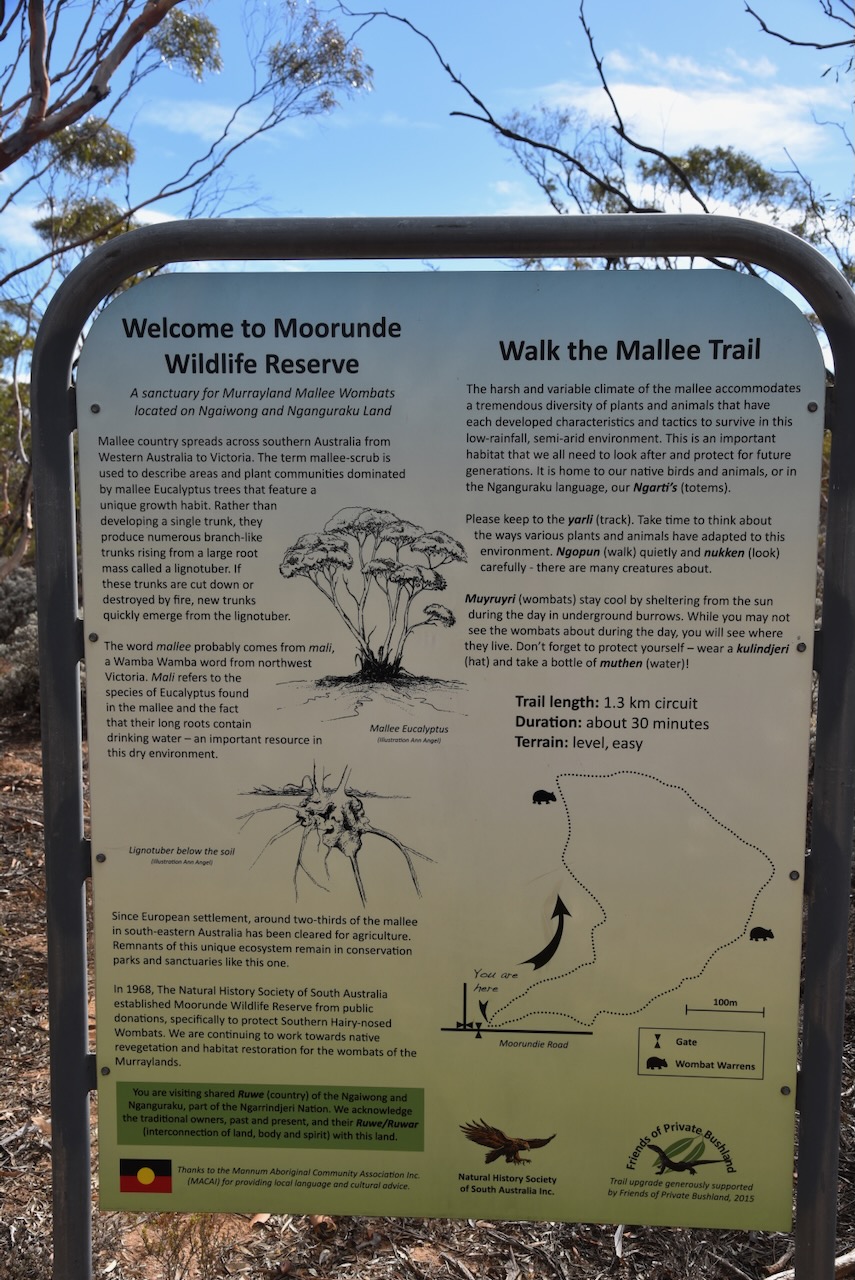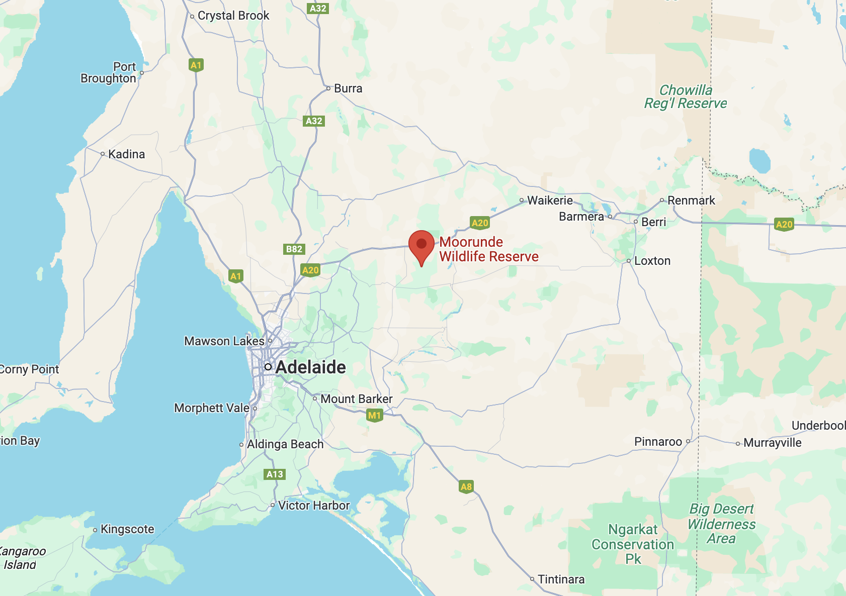 The Moorunde Wildlife Reserve is 6,900 hectares (17,000 acres) in size and comprises several Heritage Agreements of mallee country. The northern boundary of the reserve is Stury Highway. The southern boundary is Moorundie Road. To the north of the reserve is Brookfield Conservation Park, which was purchased by the Chicago Zoological Society in 1971 for the conservation of the Southern hairy-nosed wombat. (Nat Hist Soc SA 2014) (Wikipedia 2025)