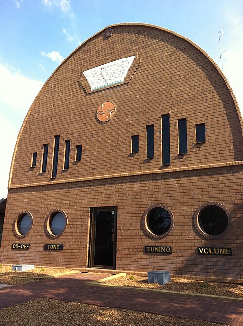 The 2BH building in Broken Hill is shaped like an old radio and contains a museum of various radios and transmitters, tape reels, and speakers. (Wikipedia 2025)
