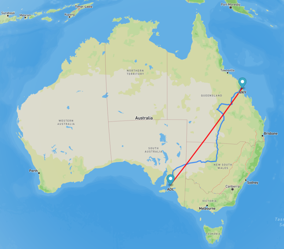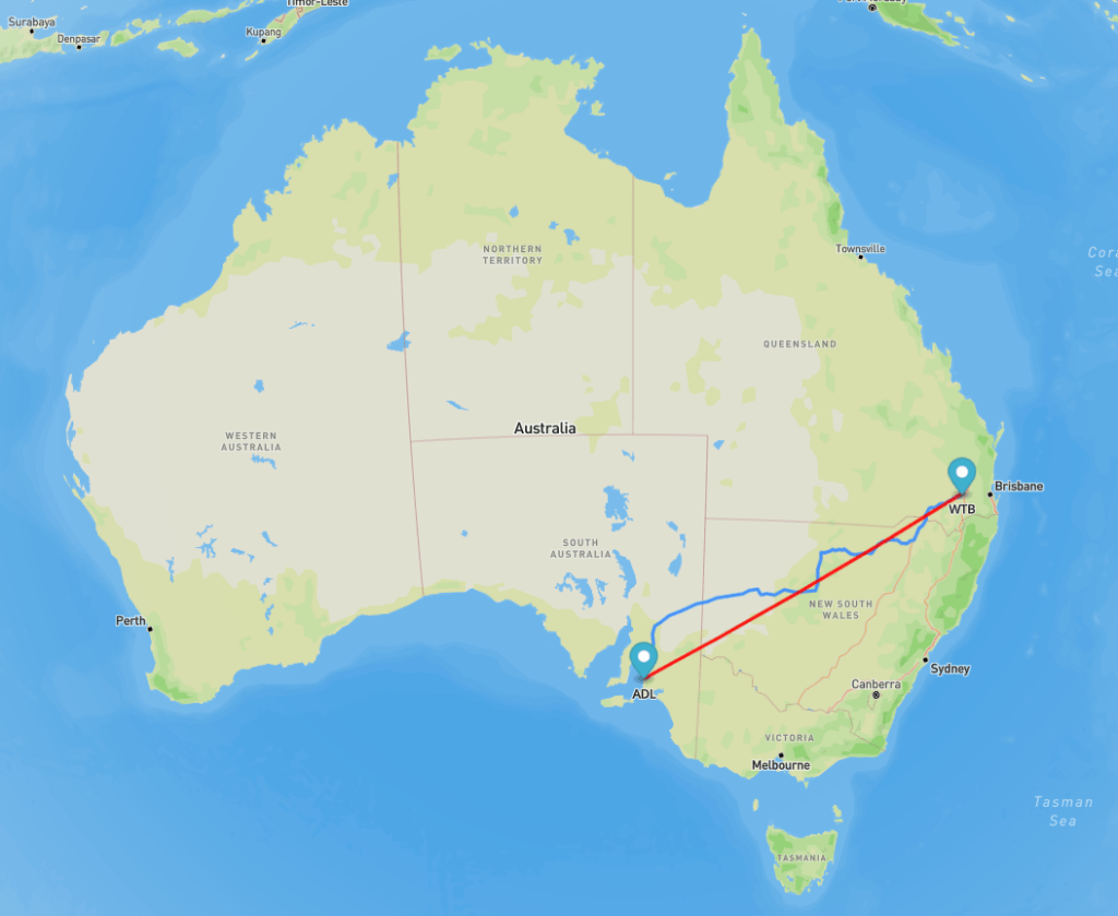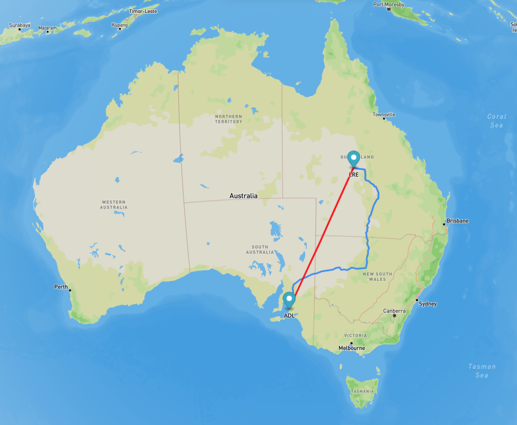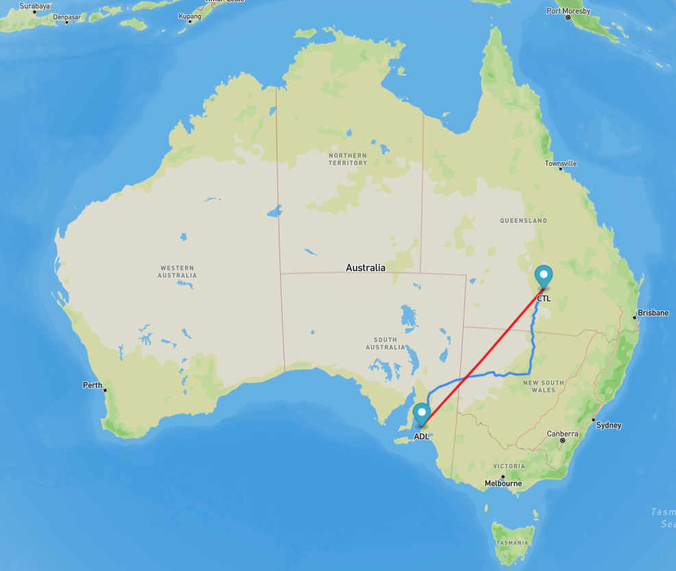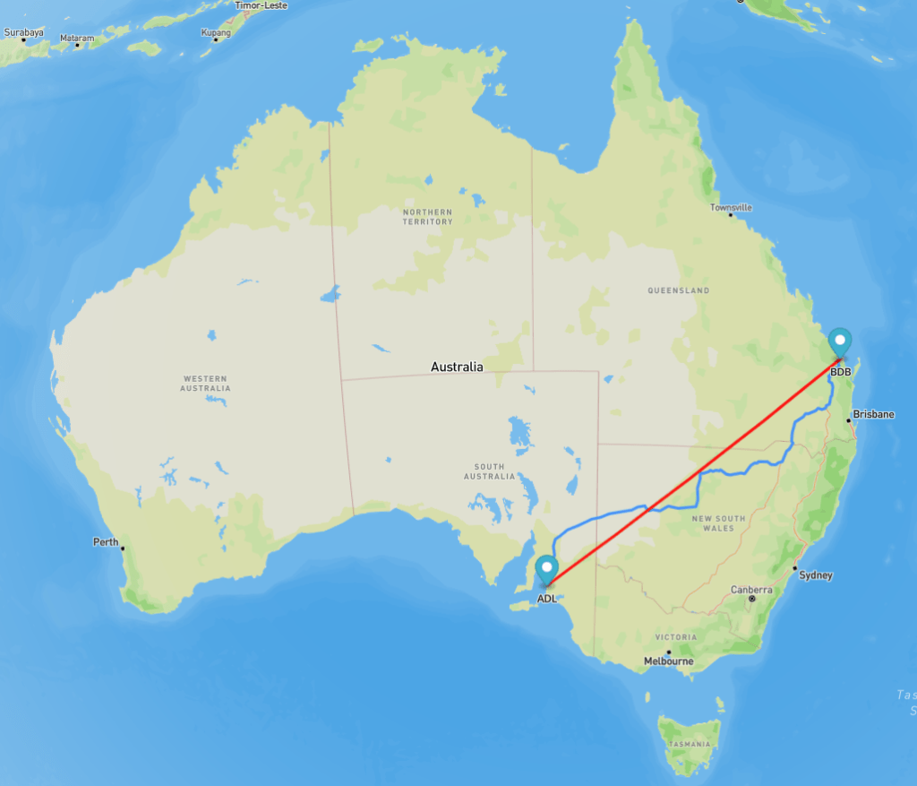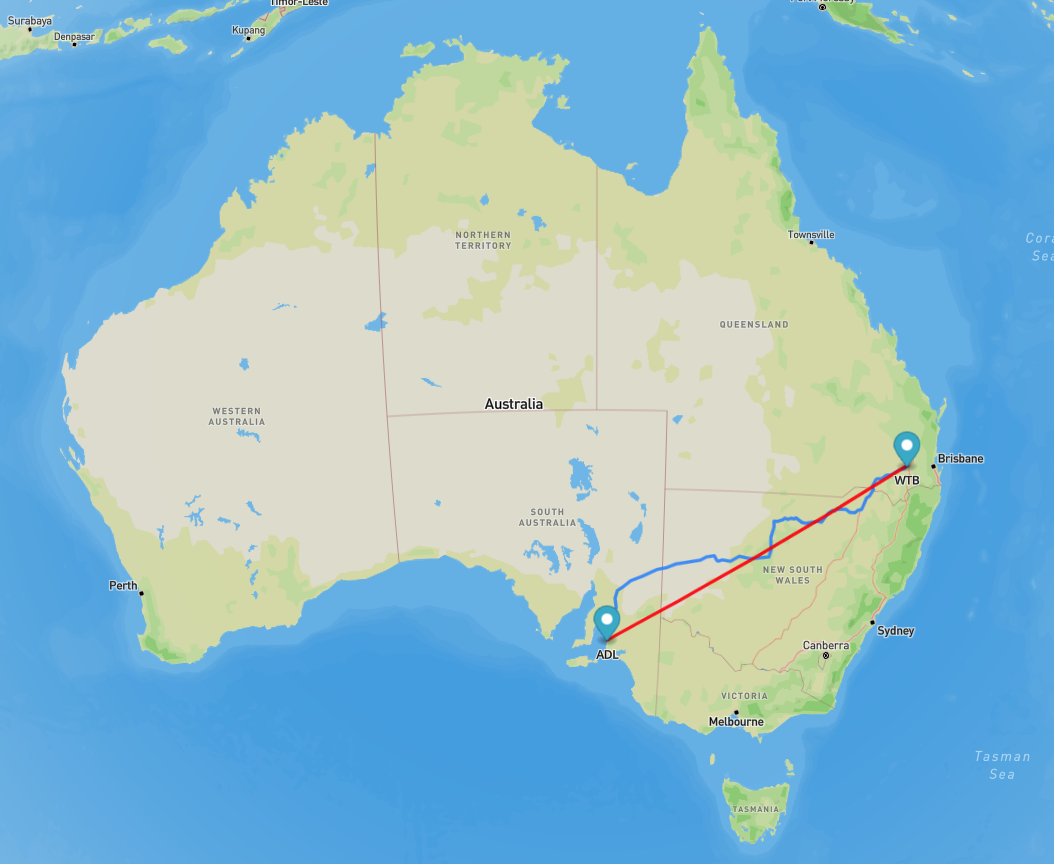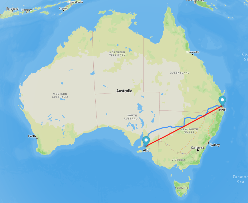 Adelaide – Brisbane: about 2,007 km