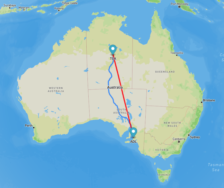 Above: Map showing the distance between my QTH and Tennant Creek. Map c/o airmilecalculator.com