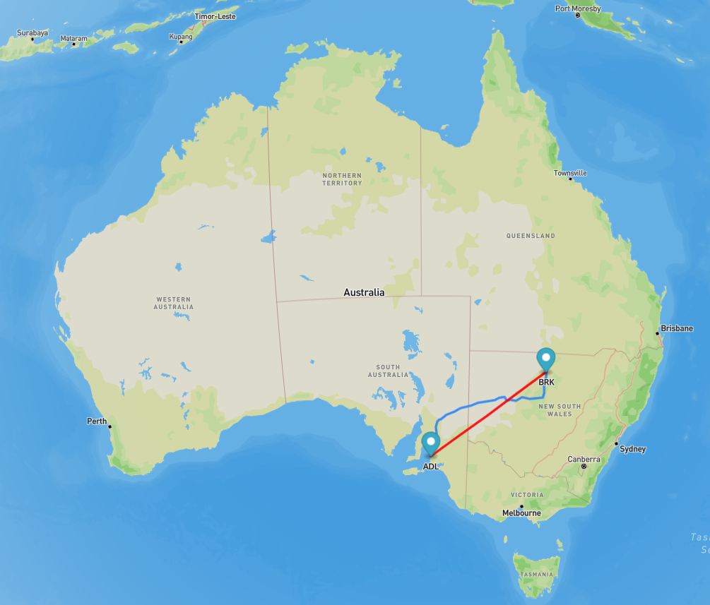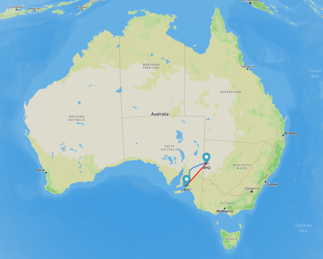 Above: Map showing the distance between my QTH and Broken Hill. Map c/o airmilescalculator.com