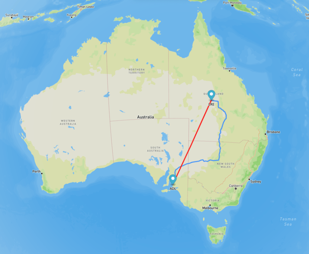 Above: Map showing the distance between my QTH and Longreach, Queensland. Map c/o airmilecalculator.com