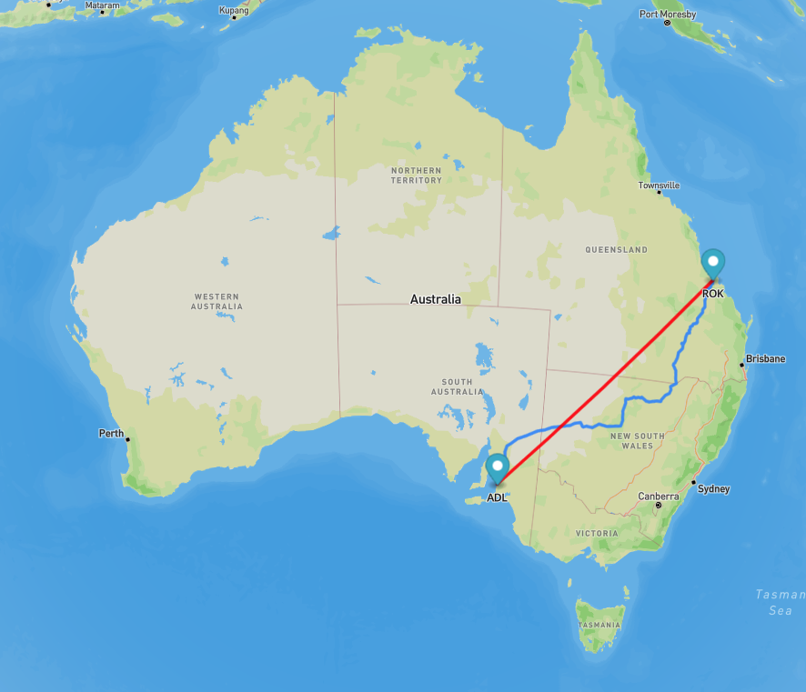 Above: Map showing the distance between my QTH and Rockhampton. Map c/o airmilecalculator.com