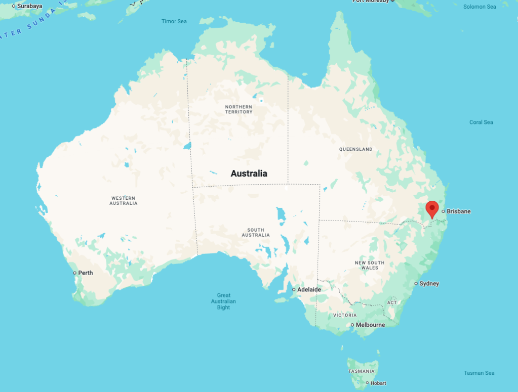 Above:- Map of Australia showing the location of Warwick. Map c/o Google Maps
