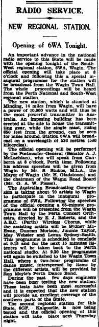 6WA’s official opening was at 8.00 p.m. Perth time, on Monday, the 7th day of December 1936. A special inaugural program for the station was broadcast from the Wagin Town Hall. 6WA’s power was 10,000 watts.