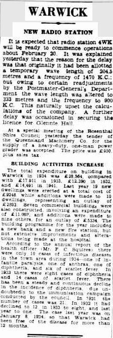 Discussions were held in 1930 for a radio station at Warwick. It was initially proposed that the station would simply be a relay station for the Australian Broadcasting Company’s National Broadcasting Service. However, the plans never eventuated. (Wikipedia 2025)