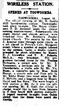 4GR was the first commercial radio station to broadcast in the state of Queensland, and the sixth oldest in Australia following 2UE Sydney, 2HD Newcastle, 2UW Sydney, 5DN Adelaide, & 3UZ Melbourne. Edward Gold had conducted test radio broadcasts in a shed from his experimental radio station 4EG. He then acquired the 4GR license and commenced broadcasting on the 17th day of August 1925. (Toowoomba 2025) (Wikipedia 2025)