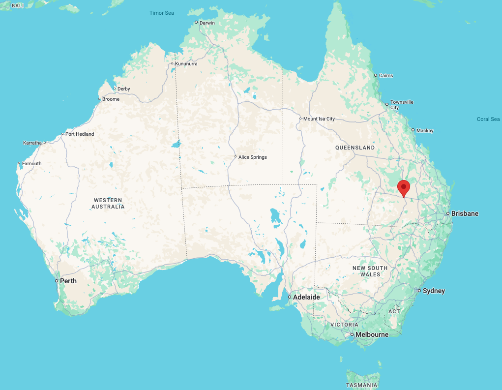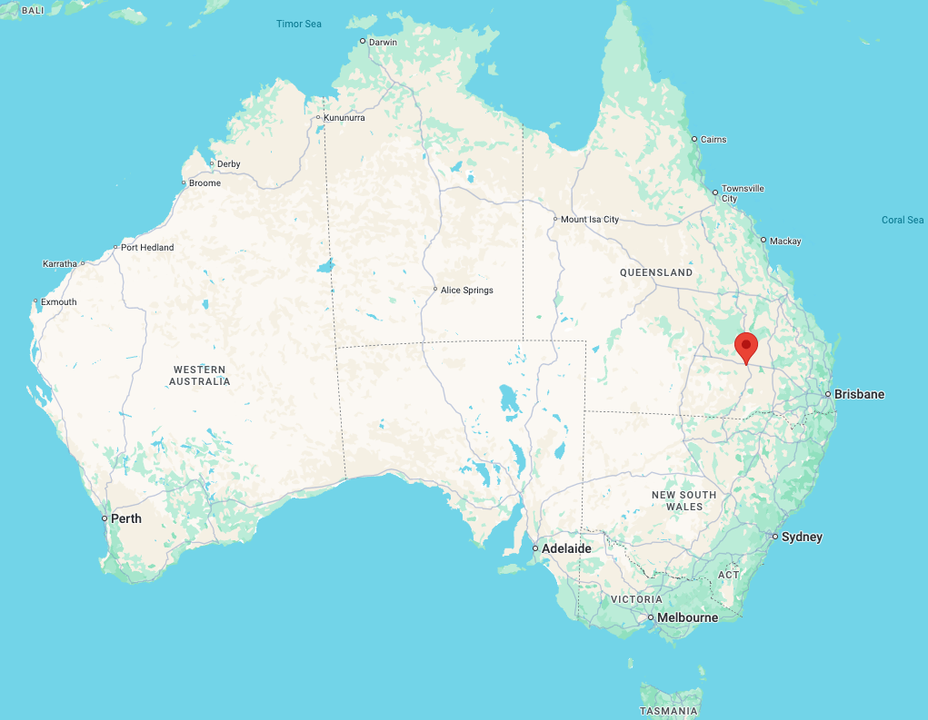 Above: Map showing the location of Roma, Queensland. Map c/o Google Maps.