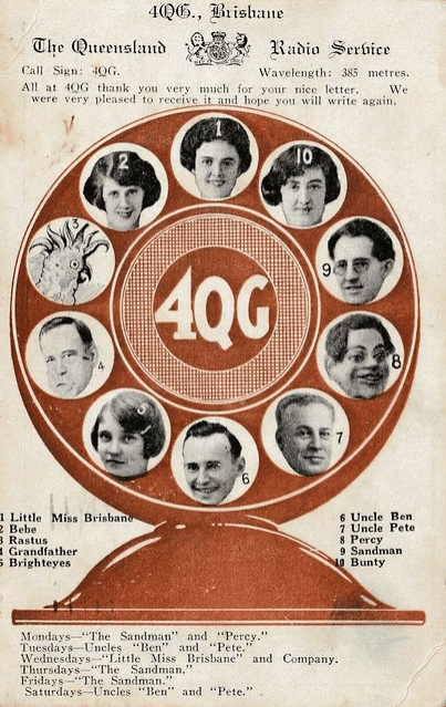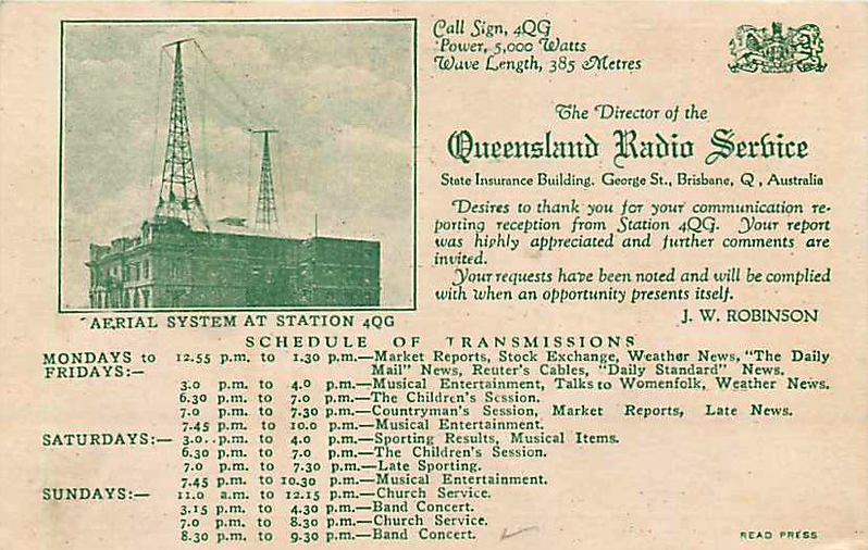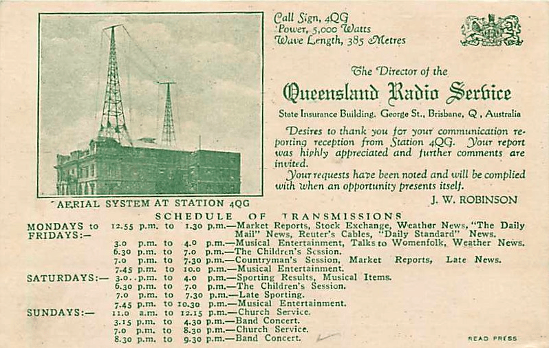 4RN initially operated under the call of 4QG, which commenced broadcasting in Brisbane in July 1925 under an A-class license. The number 4 denoted the state of Queensland, while QG stood for Queensland Government. 4QG initially operated on the frequency of 779.2 kHz. 4QG was the only station in Queensland to have been established by the Government. All other stations in Queensland were privately owned. (Wikipedia 2025)