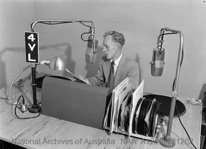 Above: John Taylor, radio announcer at 4VL, 1956. Image c/o National Archives of Australia.