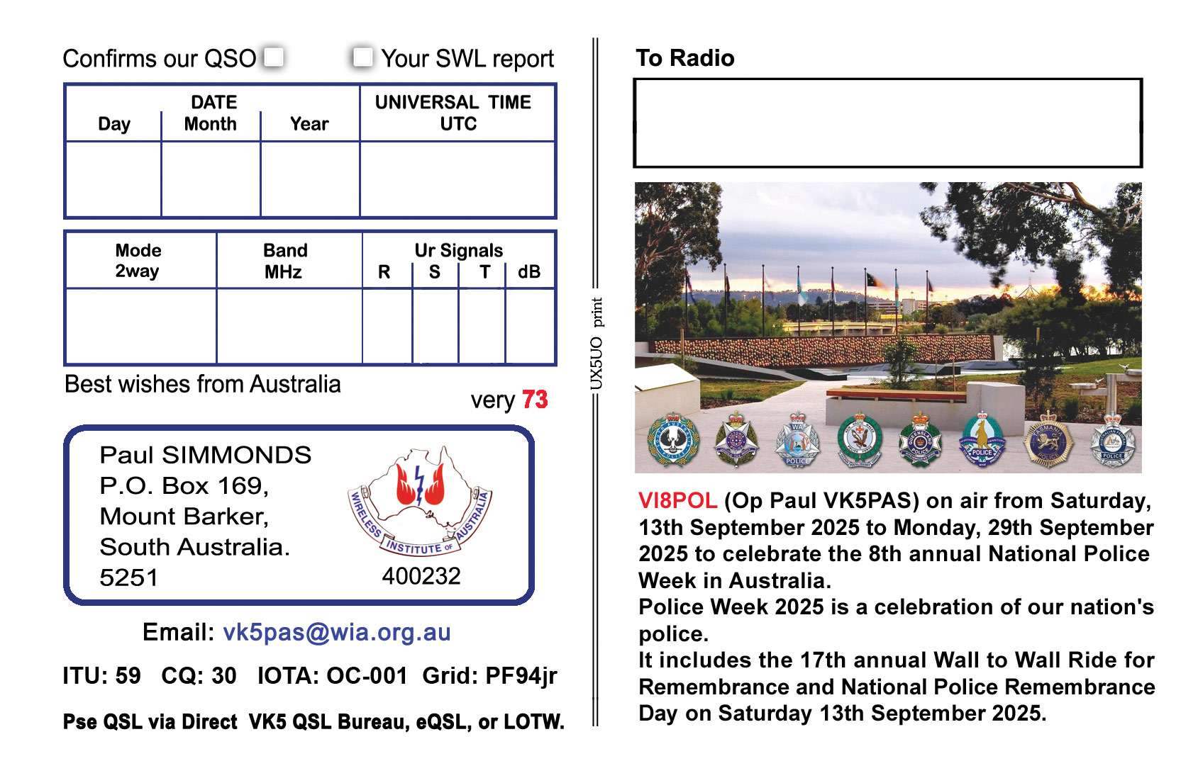 A reminder that from 13th September to 29th September 2025, I will be on air with the special event call of VI8POL for the 8th Annual National Police Week.