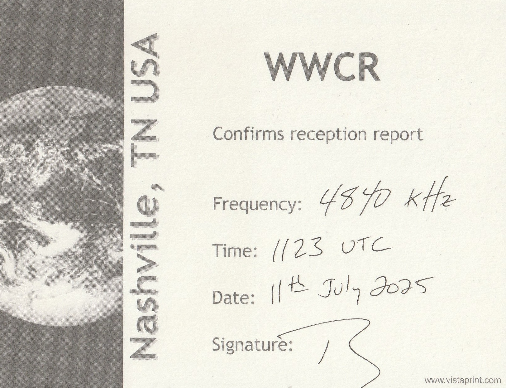 QSL card received from WWCR in the USA for my reception of their station on 4840 kHz on 11th July 2025.