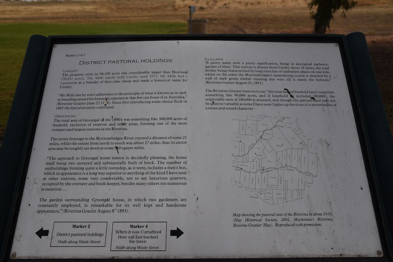 Burrabogie is derived from the Aboriginal words Burra, meaning quick and bogie, meaning swim. In 1875, Burrabogie was 500 square miles in size and had 140,000 sheep. The Burabogie homestead was recorded as one of the finest in the Riverina district. (Trove 2025)