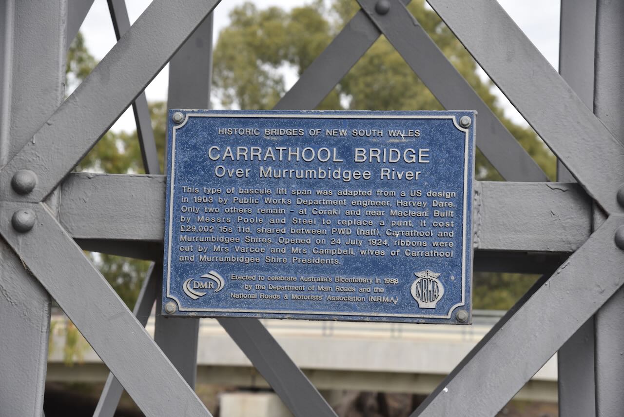 The historic Carrathool bridge, which was built in 1924, is a heritage-listed bascule lift span bridge. It is the last of its type in Australia. The bridge was constructed to replace the punt that operated on the river.