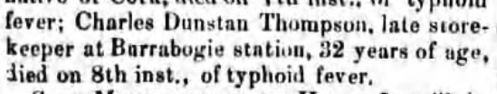 He was born in c. 1849. Charles was a storekeeper at Burrabogie Station. Charles died on the 8th day of September 1879 at Hay Hospital, aged 32 years. His cause of death was typhoid fever. (Newspapers.com 2019)